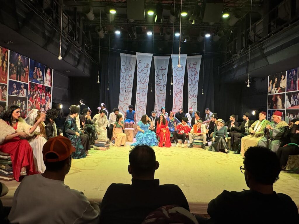 قبل الدخول إلى ذاك المسرح الصغير والحميم في قلب أوبرا مصر، ستجد رجلاً مُبتسمًا، تلمع عيناه فرحًا ومحبّة تحت نظّارتيه، وتوحي وجنتاه الحمراوان والمنتفختان قليلاً، بطيبةِ أهل الأرض في مصر. يقف في البهو الصغير بين باب الدخول إلى الأوبرا وقاعة المسرح،يُرحّب بالزوّار، ثم يدخل ليساعد في إجلاس الضيوف على المُدرّجات، ويعطي إشارة البدء لثلاثين ممثلاً جالسين على شكل نصف دائرة، مُسّمرين بلا حركة، ينظرون الى الوجوه أمامهم، ثم يصدحون فجأة، بسمفونية أصواتٍ جميلة تُبشّر بالحواديت.