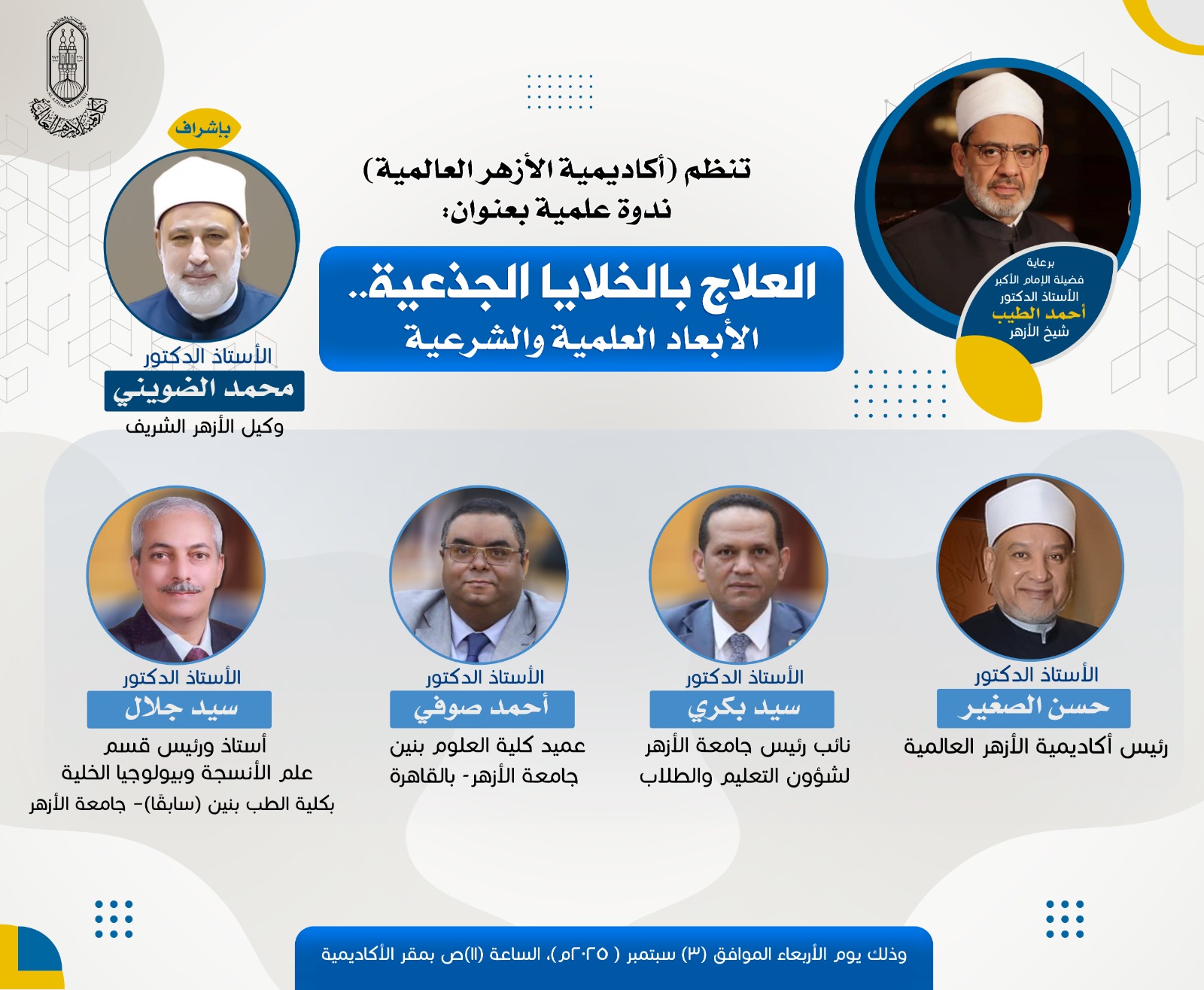 ينظم الأزهر الشريف عبر أكاديمية الأزهر العالمية لتدريب الأئمة والوعاظ، الأربعاء المقبل، ندوة علمية متخصصة بعنوان “العلاج بالخلايا الجذعية.. الأبعاد الطبية والشرعية.